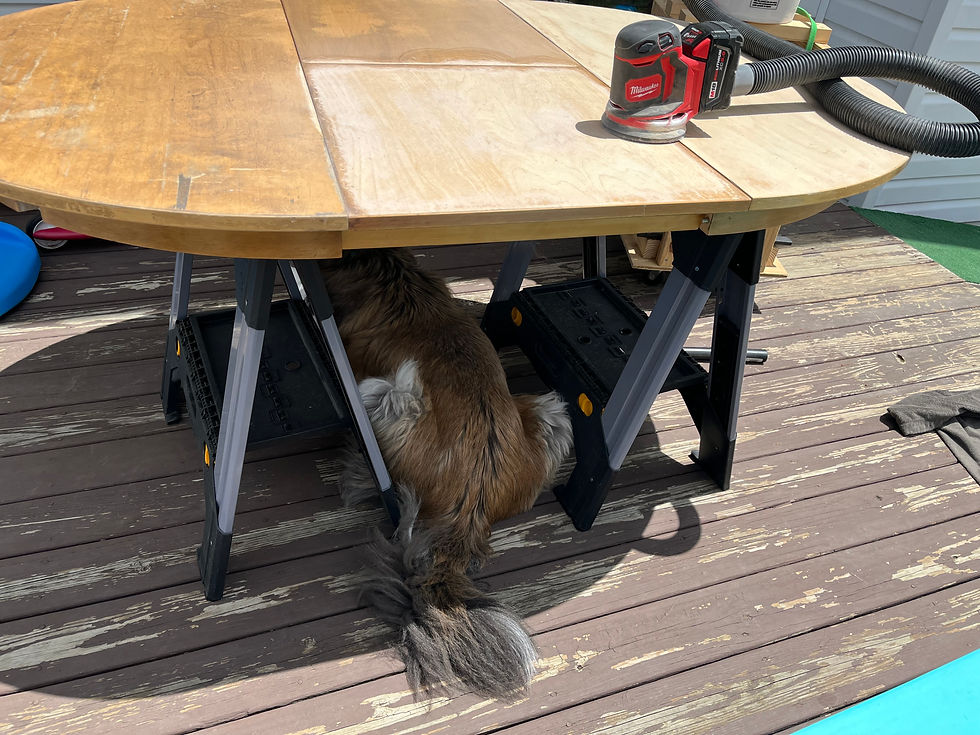 Although it was a nice sturdy table, it wasn't a solid wood table, I think it was originally from Ikea. It had the appearance of wood but had veneer on top. so I wanted to sand it enough to where it would be able to be primed and painted, but not so much that it removed the entire top layer. Thankfully it was a nice day outside so I was able to enjoy the weather, blast some music, and get in the sanding zone!
