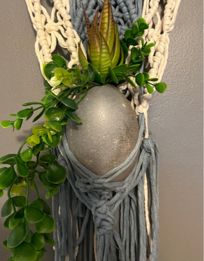 I had no idea what kind of plant or pot holder I wanted to go in them though, so I didn't even know where to start.... and then along came my sister! She comes walking in with a big box full of these dinosaur looking eggs! She's done her own art projects with them in the past (apparently they are very difficult to work with) Some of the eggs had holes she already drilled into them, so we started testing out some little succulent plants (fake ones.... I cannot keep real plants alive to save my life). Once we saw how cool they looked, there was no stopping the macrame train at that point. For the next couple weeks I started making a variety of plant holders for all the different size eggs! It may have been a slight addiction there for little while....
